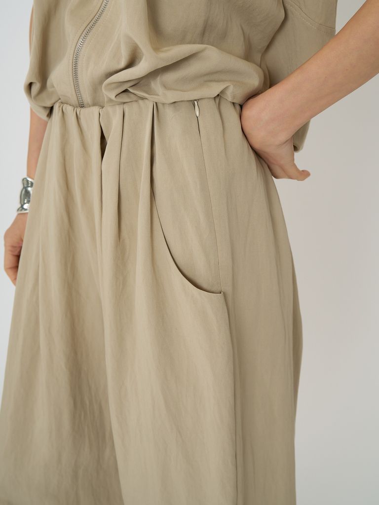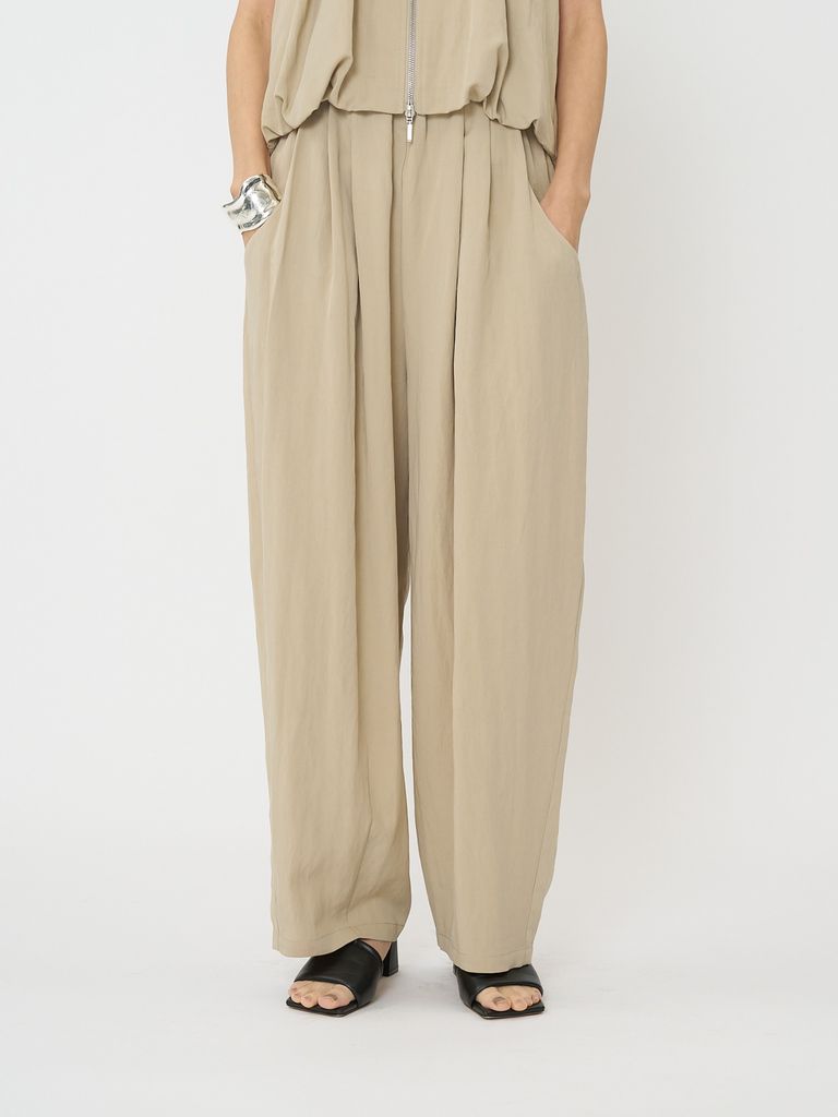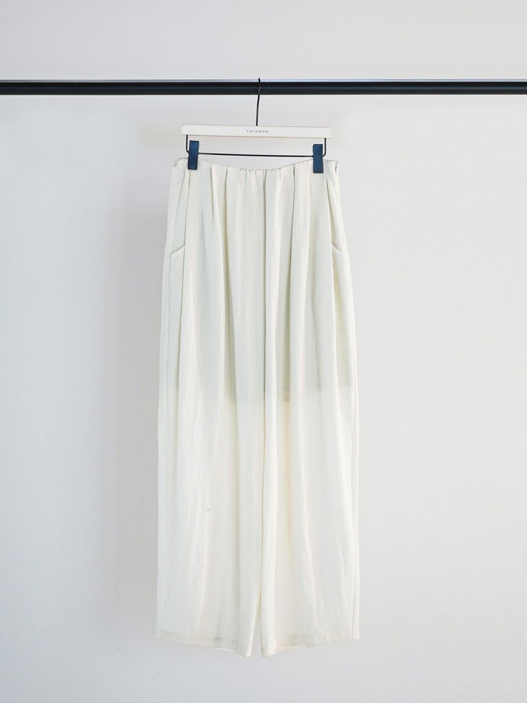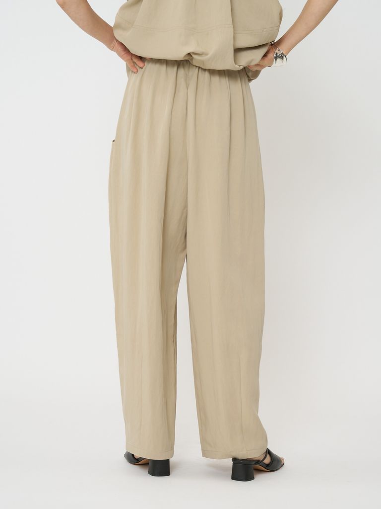 ゴムを内側に配し、ウェストをタックでまとめているので、カジュアル過ぎずきれいめに着こなせる1本。
