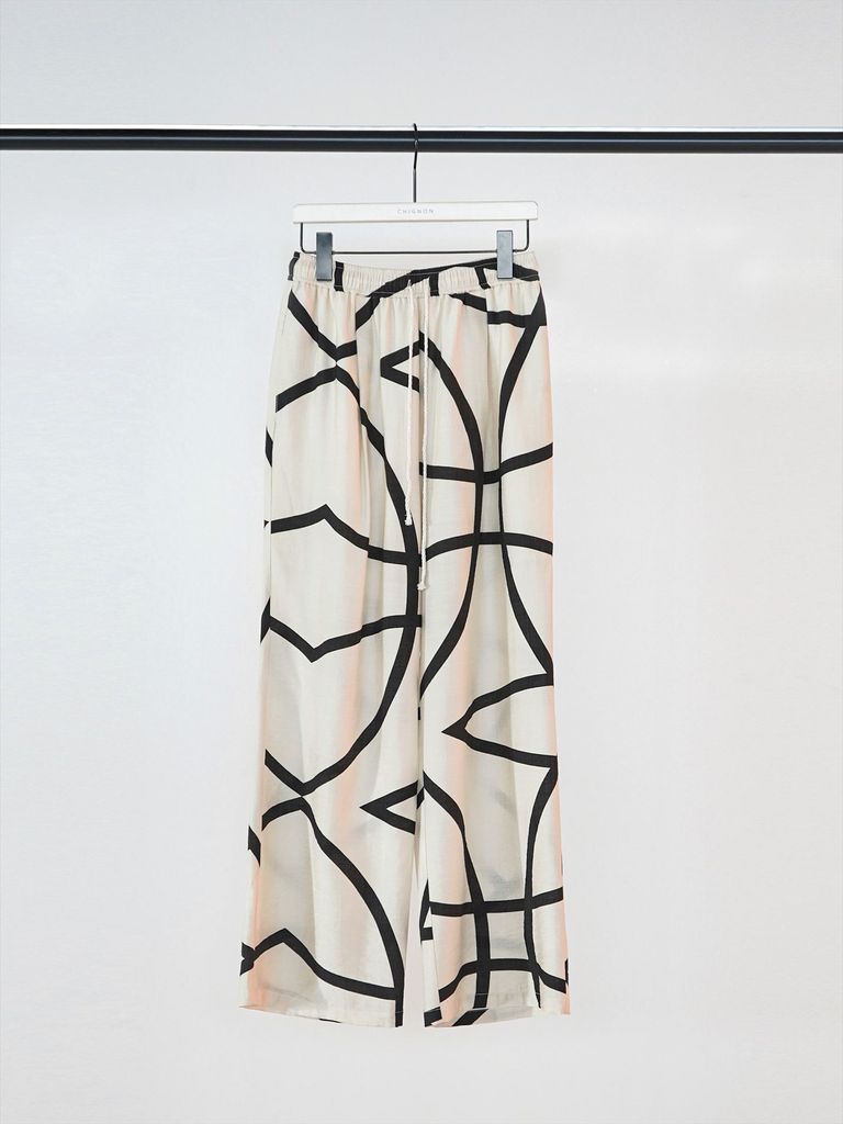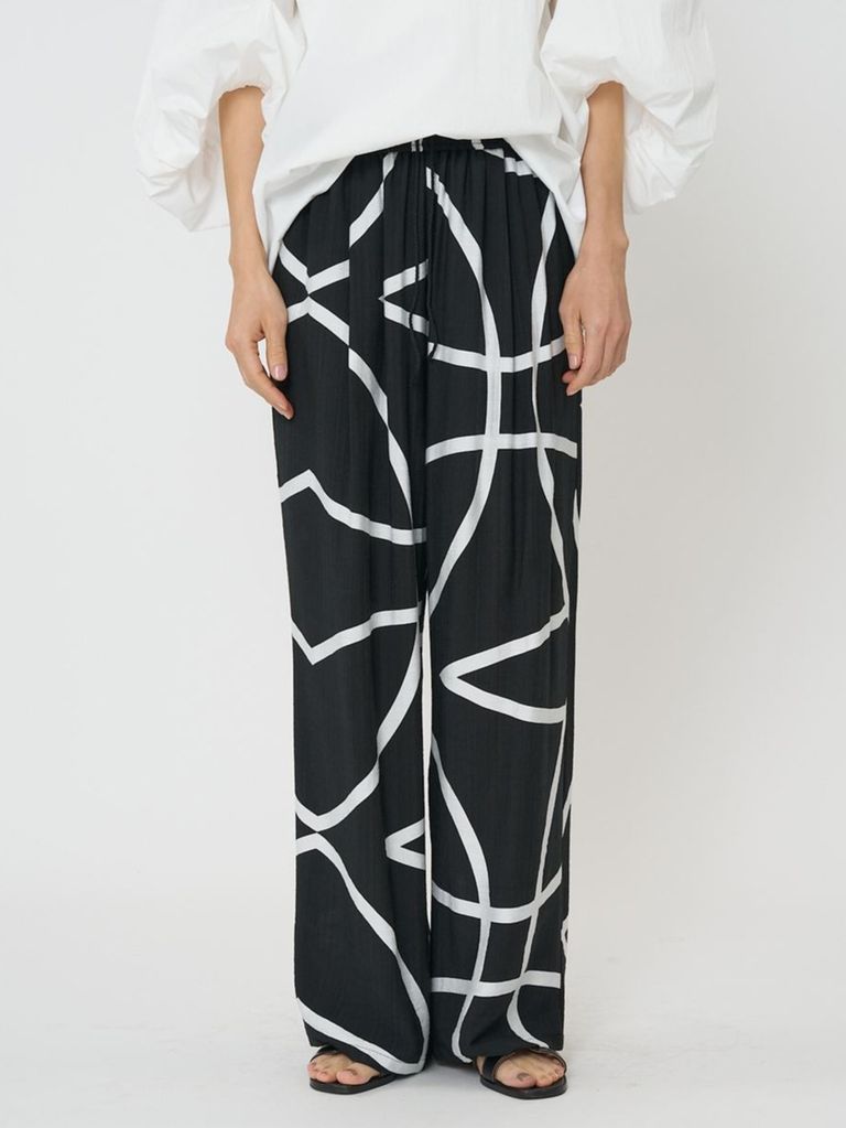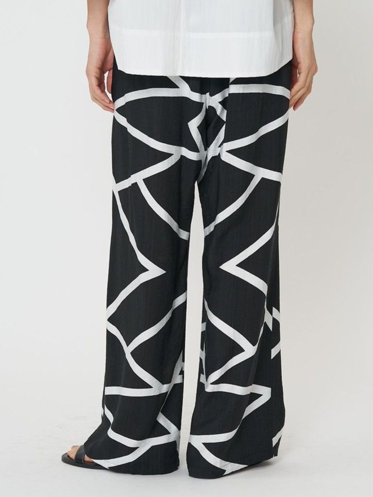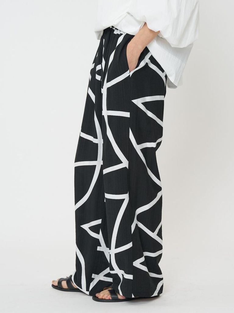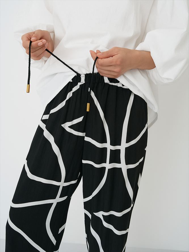 ゆったりとしたシルエットながらもすっきり見えるデザインに仕上げました。ウエストは総ゴム仕様で、ストレスのない穿き心地。大胆なライン柄がスタイリングにアクセントを加え、シンプルなトップスと合わせるだけで印象的な着こなしに。軽やかな素材感で、シーズンを問わず楽しめる一枚です。