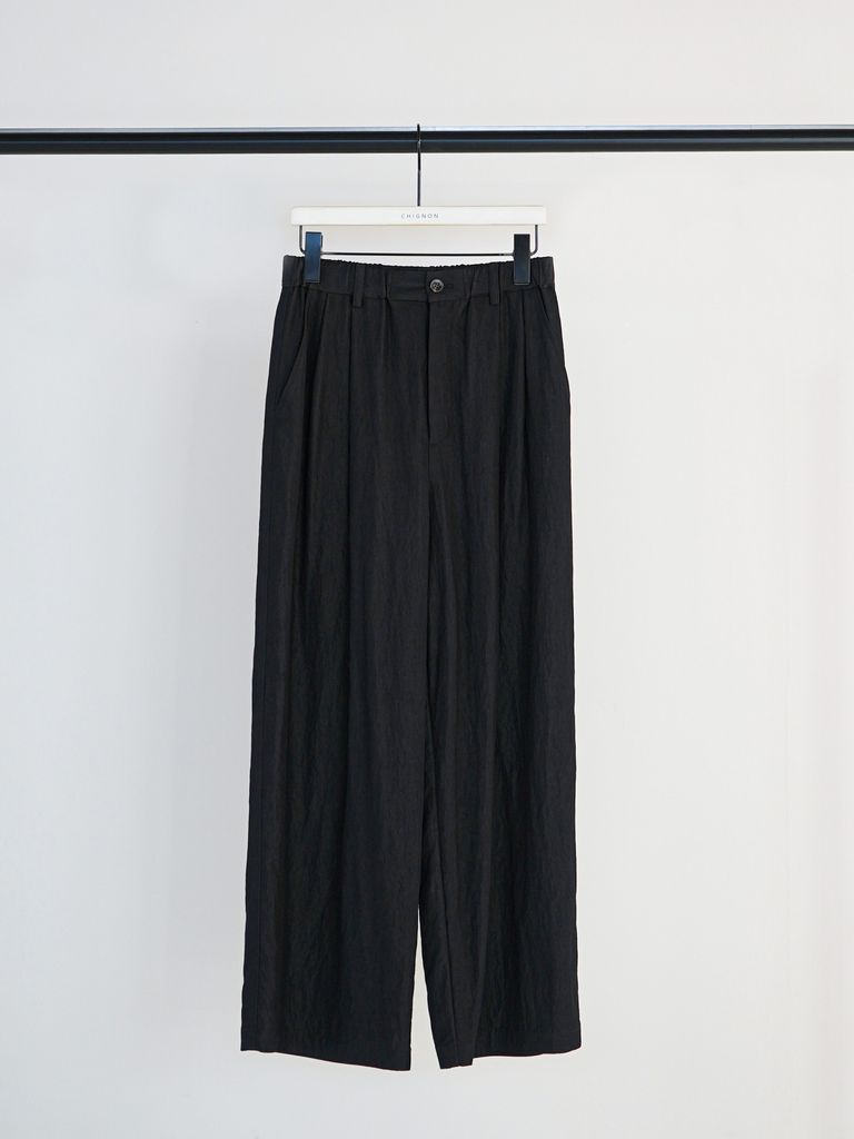 なめらかなとろみ感が心地良いシャンブレーのレーヨンナイロン素材を使用したワイドシルエットのスラックスパンツ。