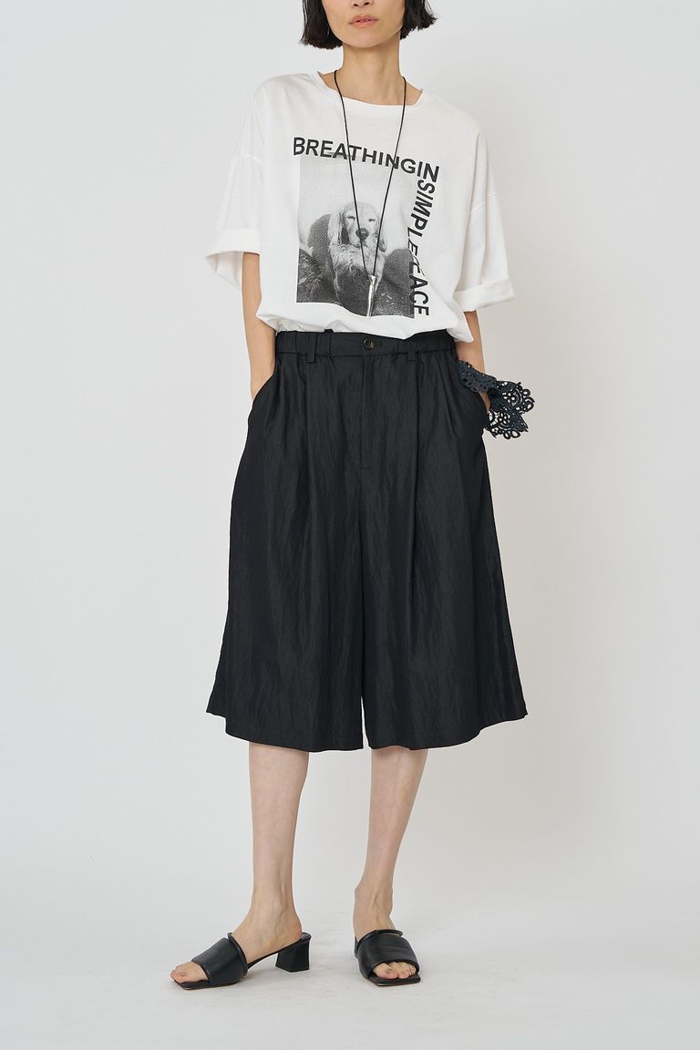 ゆるっとしたリラックスシルエットで、ウエストに2タックをいれることで、腰回りをすっきりと見せてくれます。ウエスト後部分にはゴムを、さらにの内側にはサイズ調整が可能な紐を通しており、着心地も快適です。着丈は膝下丈で、大人の女性もチャレンジしやすい絶妙なバランスです。足元は、きれいめなパンプスや、軽快なサンダルを合わせるのがおすすめ。セットアップでの着こなしはもちろん、今までのTOPSに1枚合わせることで、今年らしいトレンド感のあるコーディネートが楽しめます。