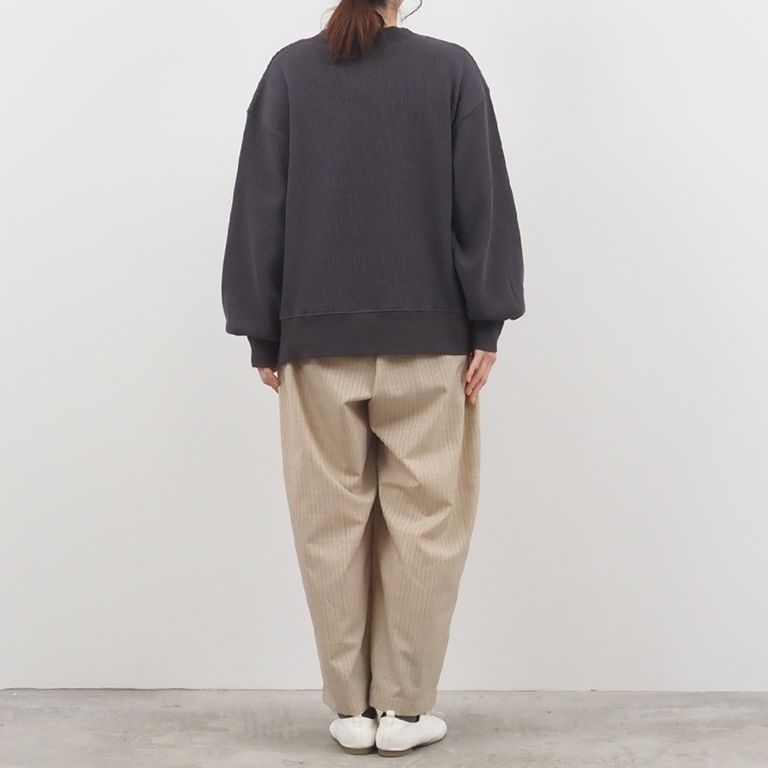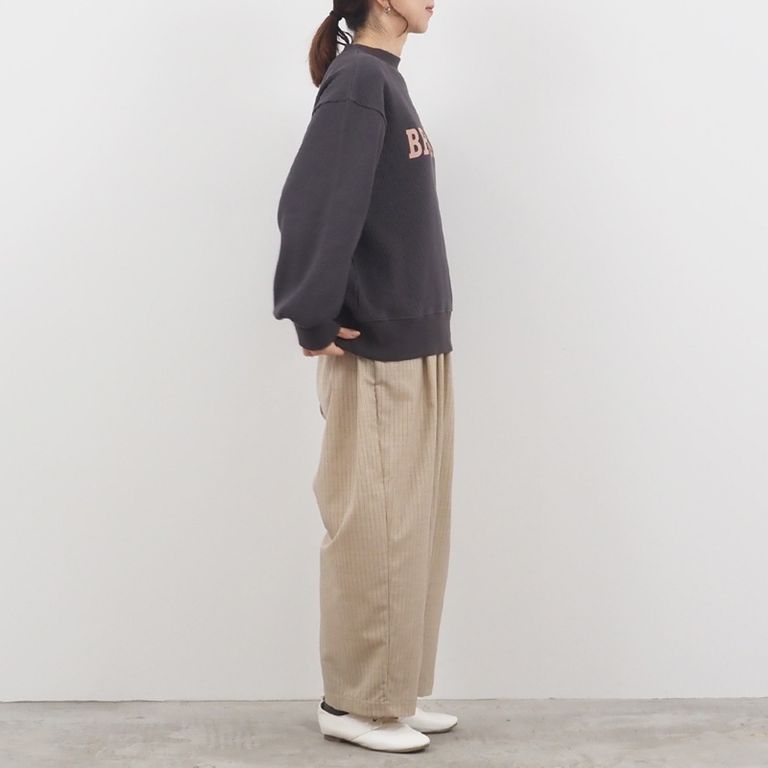 NARUの人気アイテムイージーパンツ、ウエストはゴム仕様で深めのまた上、ゆったりシルエットでもさまになります。今回はストライプ柄を入荷しました、デニムやチノパンとくらべてキレイ目なコーディネートができます。