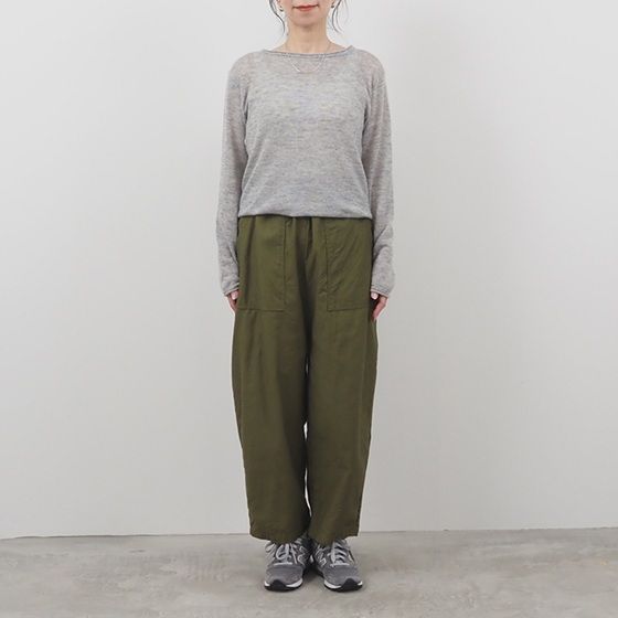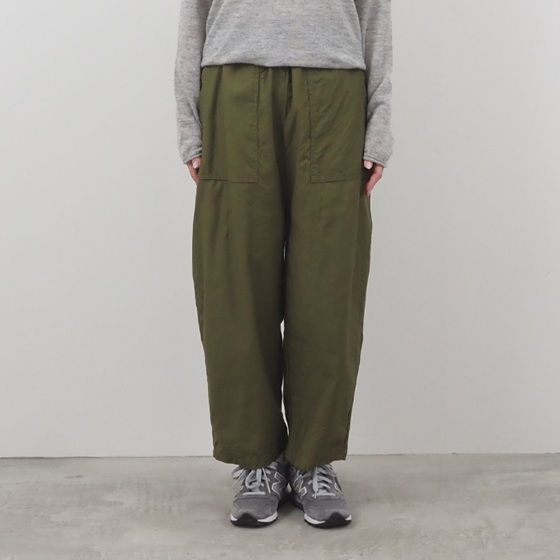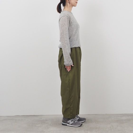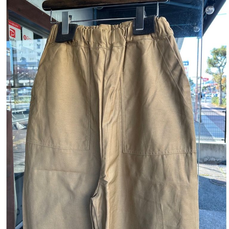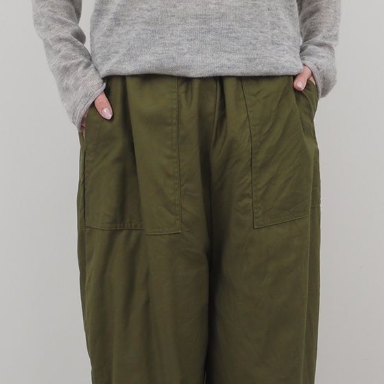 ハリ感があり、シルエットがきれいです。ほんのりとした光沢もかわいいです。大きめのパッチポケットがアクセントの クラフトパンツ。程よくゆとりのあるシルエットで、気になる部分をカバーしてくれます。フロントに施された大きなパッチポケットが印象的で、横から見たときもサマになるワークパンツです。ウエストはゴムと紐で調節可能。リラックスしてご着用していただけます。