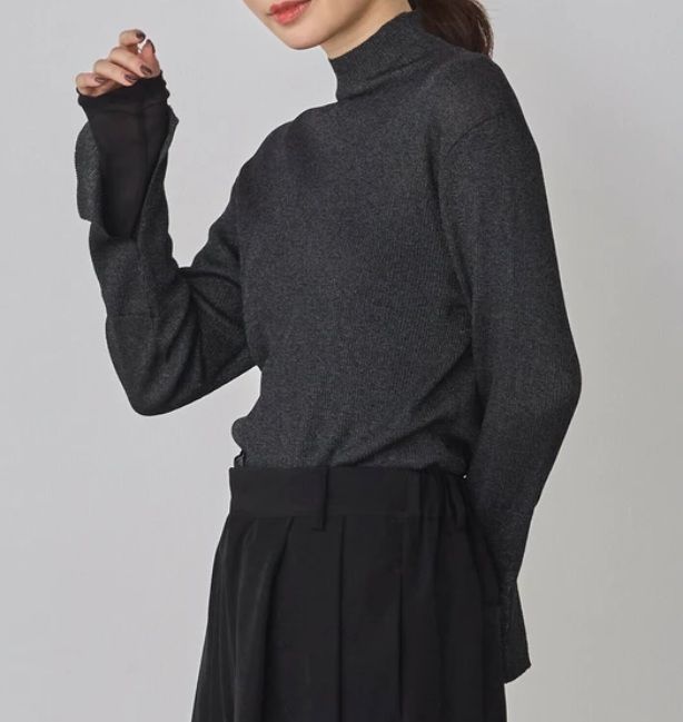 ラメ袖レイヤードリブタートルニット ブラック
