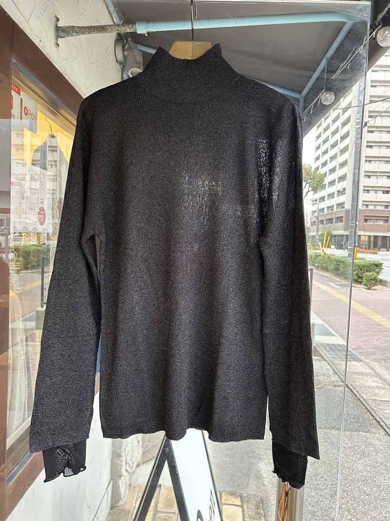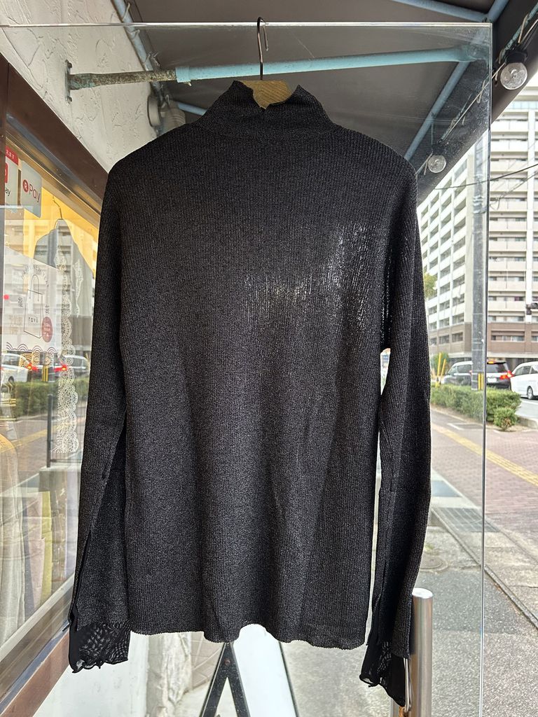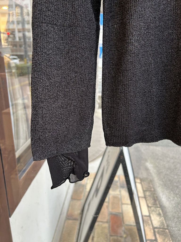 袖にパワーネットの別素材をレイヤードしたラメリブニットです。