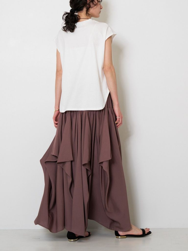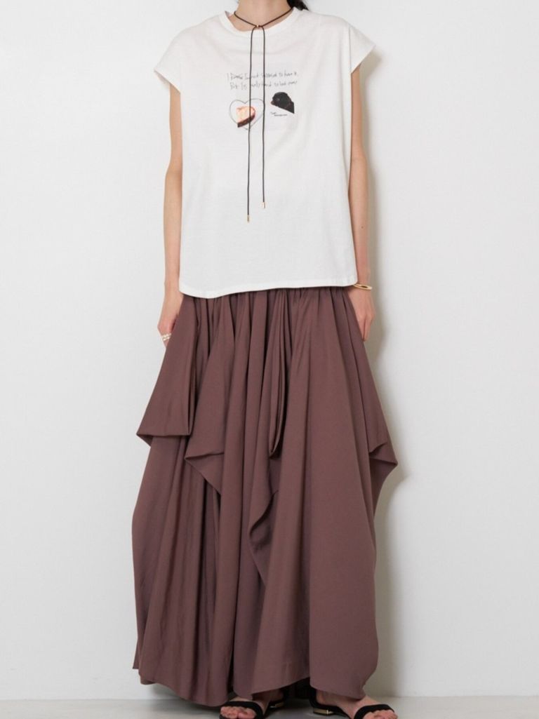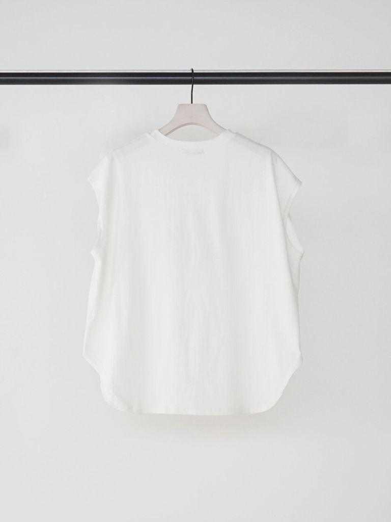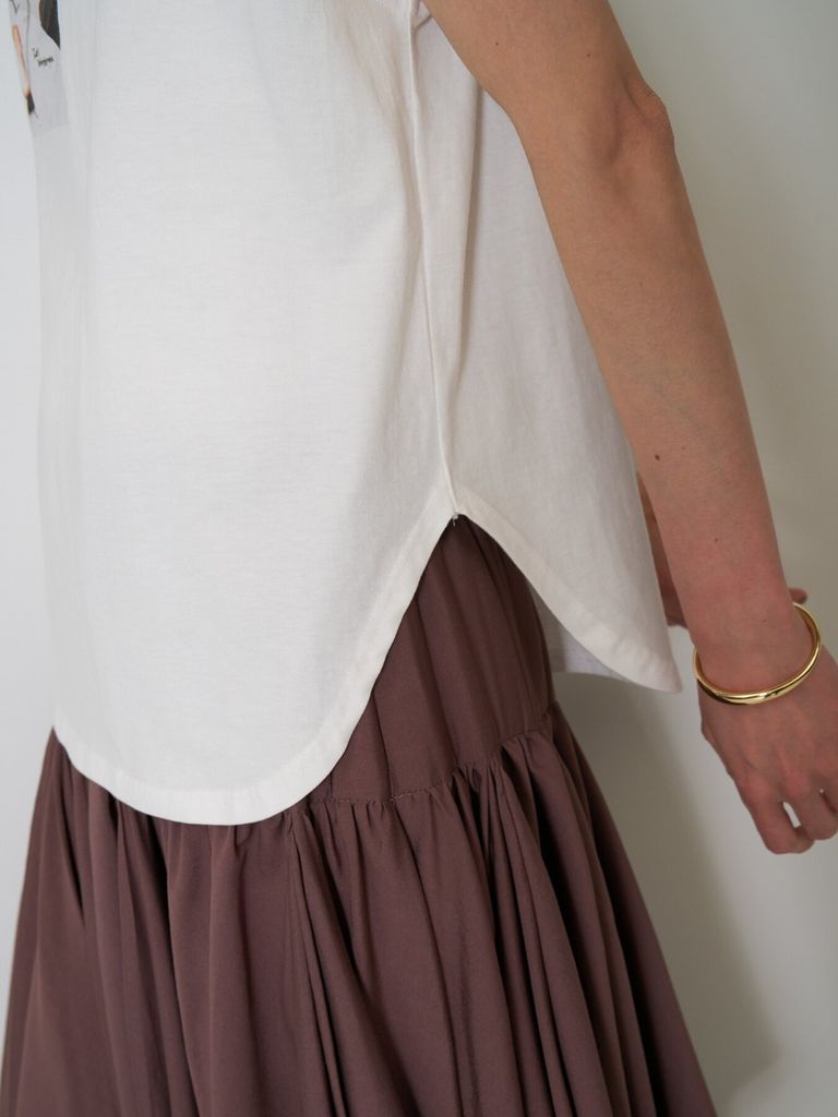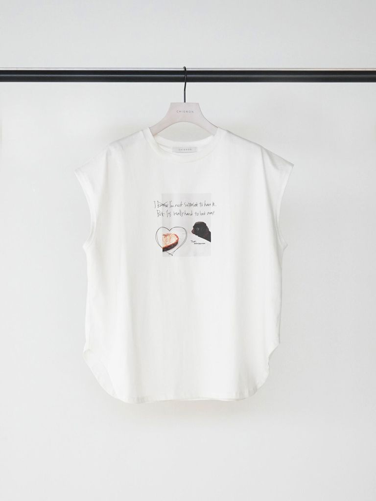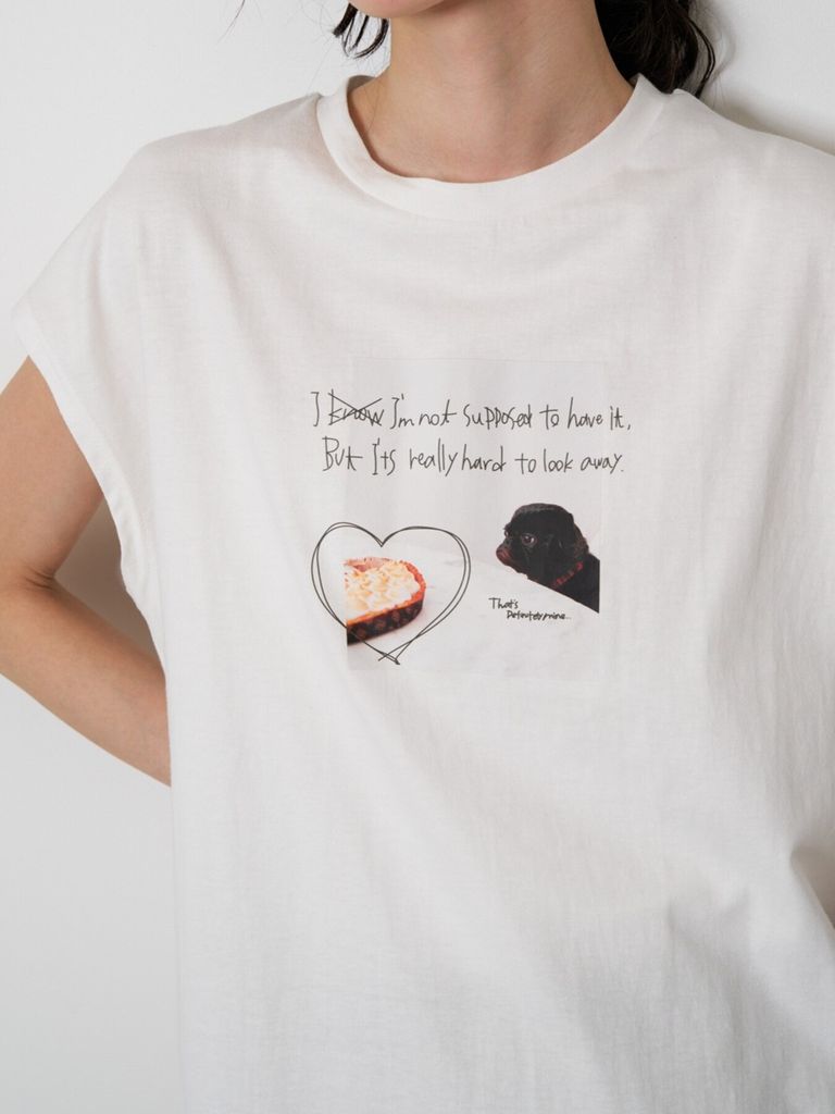ミニマルな雰囲気の中にケーキを見つめる犬の写真と手書きロゴを添えて愛らしい1枚に仕上がりました。”I know I'm not supposed to here it. but I'ts really hard to look away"「本当は手に入れちゃいけないってわかってるけど目をそらすのがむずかしい」 素材は程よい厚みの20天竺をセレクト。肩にかかる絶妙なフレンチスリーブ風シルエットで、二の腕をさりげなくカバーしつつ、抜け感のある印象に。裾はラウンドカットで、アウトしてもバランスよく決まります。夏から秋にかけてカジュアルに使える大人の万能TOPSです。