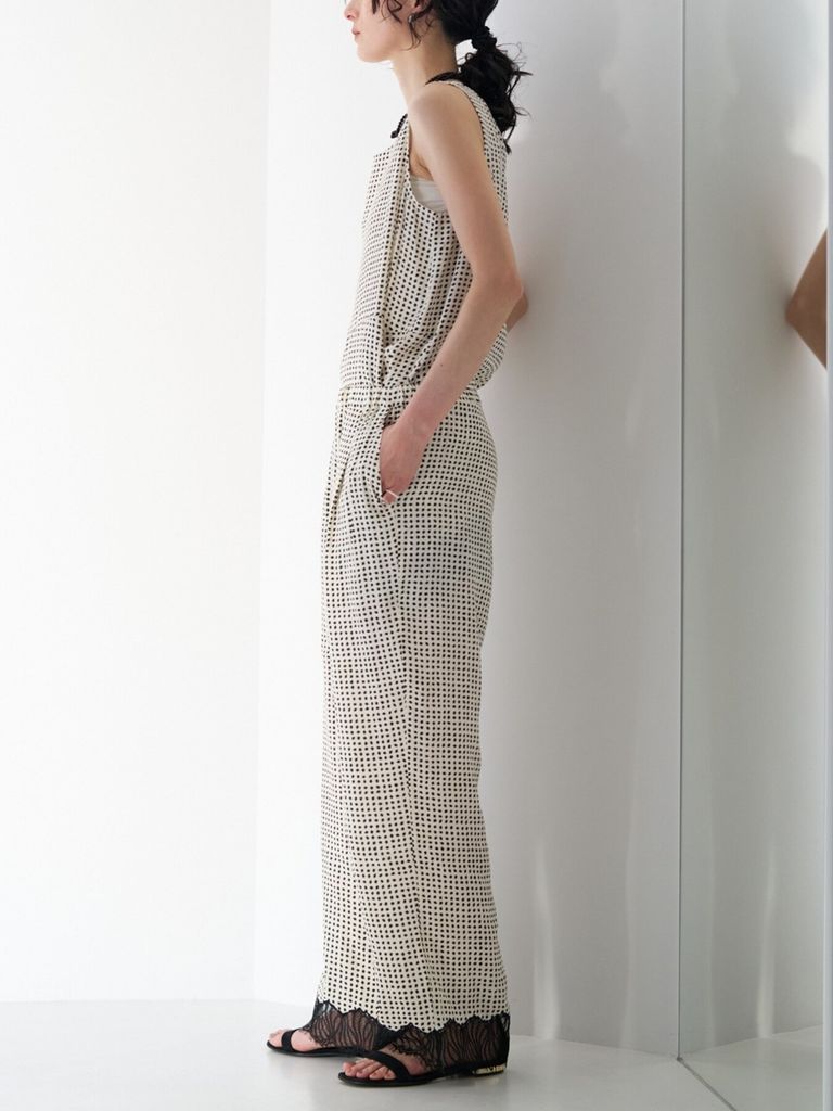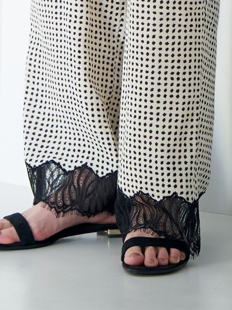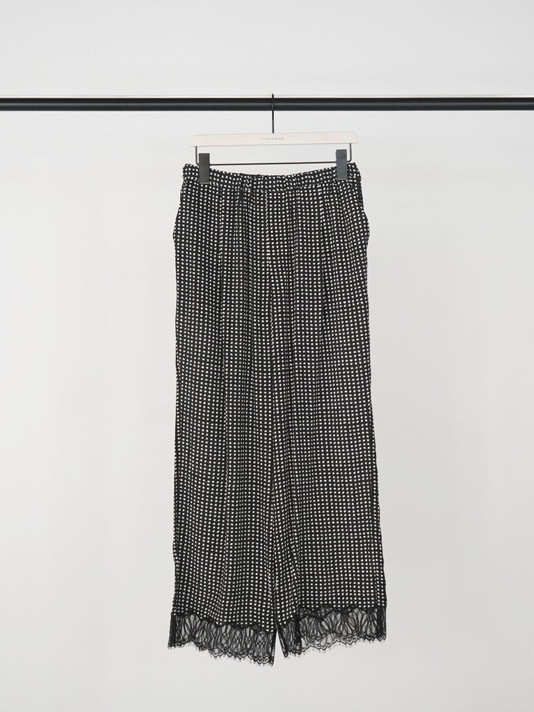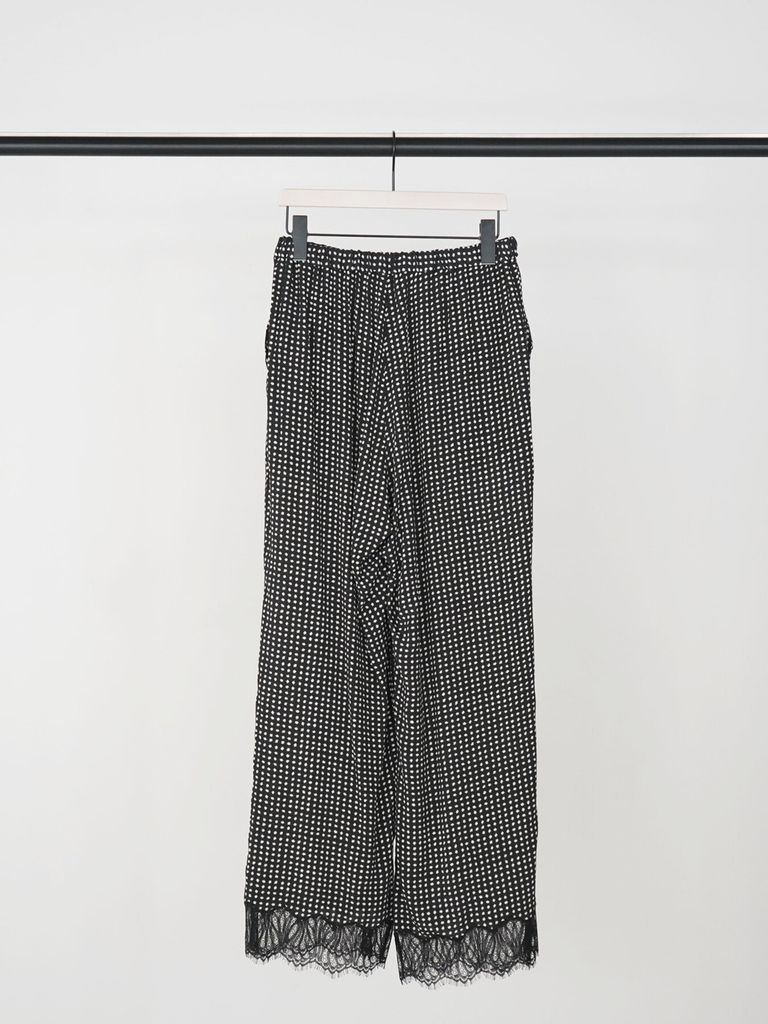 小粒の変形ドット柄に裾レースを刺繍した、軽やかな印象のイージーパンツ。