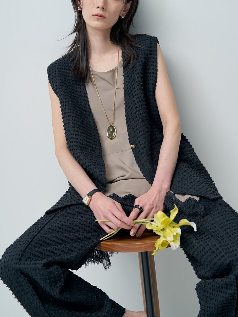 予約商品 残りわずか CHIGNON [4863-653YM] ドットJQオーバージレ ブラック ¥21,780 税込 198 ポイント還元 入荷予定時期:2026年06月上旬 この商品は 送料無料 でお届けします 注文 サイズ(採寸)情報 質問する お気に入り コーディネートをリクエストする お電話でもご注文いただけます!お電話の際は 商品番号:2861 をお知らせください。 電話をかける 0835-22-9378 サイズ 身幅 後身頃 前身頃 肩幅 FREE 56 73.5 74.5 41 単位:cm 商品説明 程よい丸みを帯びたコクーンシルエットが印象的なジレ。やや長めの丈感が縦のラインを強調し、さっと羽織るだけでスタイリングにモードなニュアンスをプラスします。深めのVネックが顔まわりをすっきりと見せ、インナーとのレイヤードもバランスよく決まるデザイン。フロントのニュアンス釦がさりげないアクセントになり、シンプルながら存在感のある一着に仕上がっています。素材には、表情豊かなドット調のカットジャカードを使用。凹凸のある立体的なテクスチャーが目を引き、季節の変わり目のコーディネートに新鮮さを添えます。同素材のボトムと合わせたセットアップスタイルなら、より洗練されたモード感のある着こなしに。ワンピースの上に羽織ったり、ボリュームのあるスカートと合わせてメリハリのあるシルエットを楽しむのもおすすめ。夏はノースリーブやTシャツにさらりと、秋にはブラウスやロンTとレイヤードして。シーズンレスで活躍する、着回し力の高いアイテムです。 詳細情報 カラー ブラック 素材 レーヨン:80% / ナイロン:20% ブランド CHIGNON 品番 4863-653YMblk カテゴリ トップス > ベスト 性別 女性 着用モデル情報 着用サイズ:FREE 返品 返品可能条件はこちら ラッピング 不可 入荷予定時期 2026年06月上旬 配送方法 佐川急便(送料について) お支払い方法 本商品でご利用可能な決済方法は下記となります。各お支払い方法についての詳細はショッピングガイドをご覧ください クレジットカード決済 セキュリティコードとはクレジットカード裏面のサイン欄上部に記載されている数字の一番右の3桁の数字です。アメリカン・エキスプレス・カード提携のクレジットカードの場合、セキュリティコードはクレジットカード表面に記載されている4桁の数字となります。 楽天ペイ 銀行振込 サイズ(採寸)情報 サイズ 身幅 後身頃 前身頃 肩幅 FREE 56 73.5 74.5 41 単位:cm このアイテムをシェア この商品について質問する