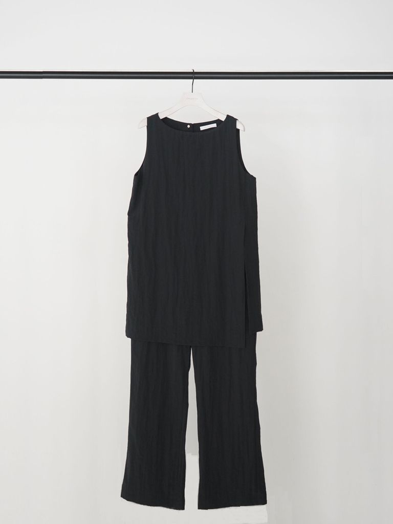 落ち感のある素材が縦のラインを強調し、全体をすっきりとした印象にまとめます。