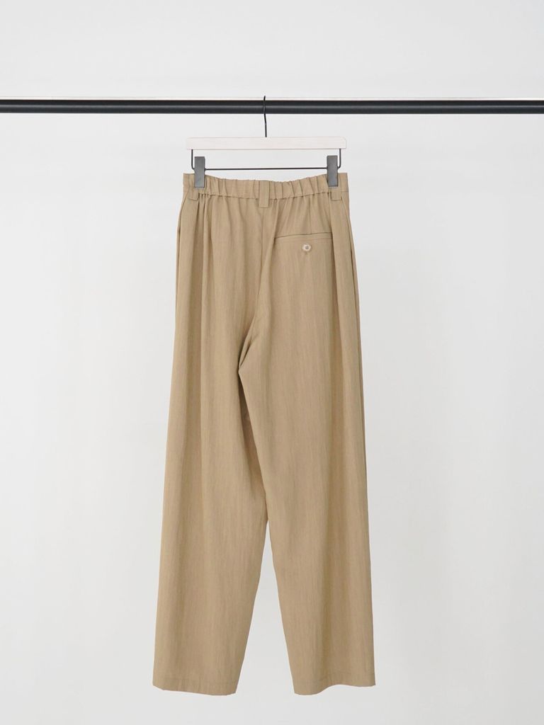 落ち感のあるポリエステルレーヨン素材を使用した、サイドタックがポイントのワイドパンツ。