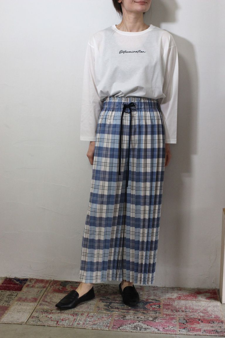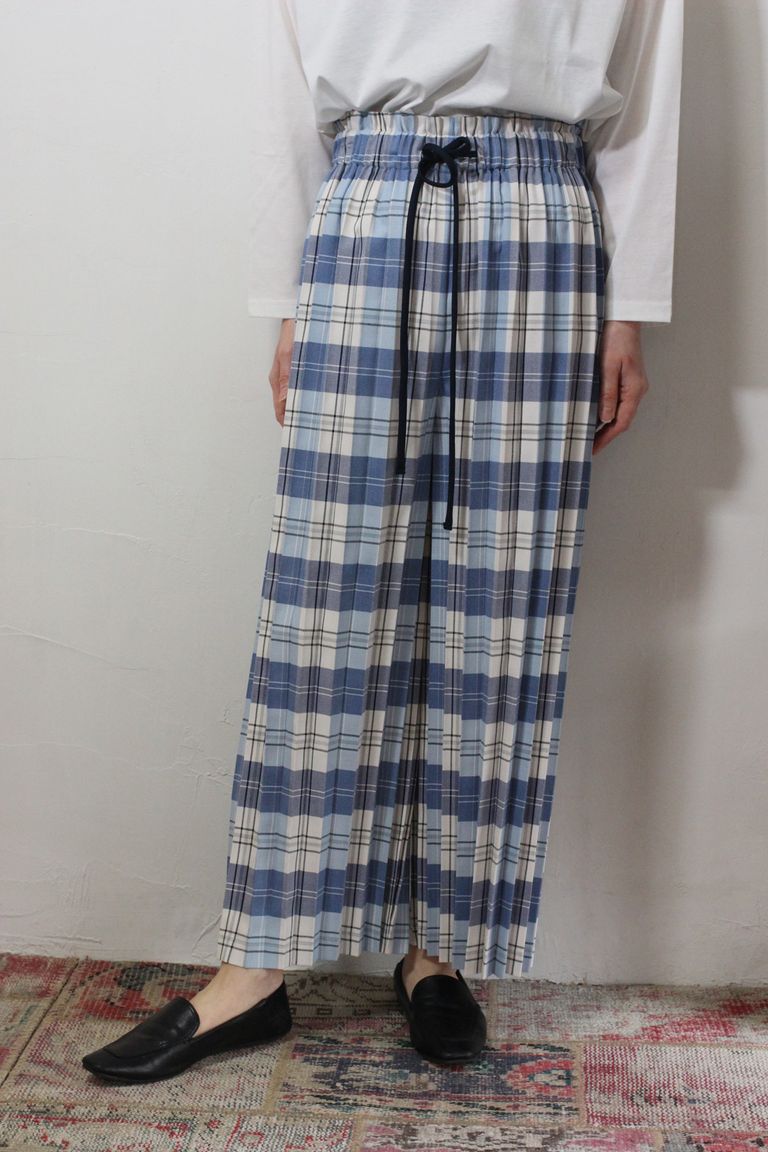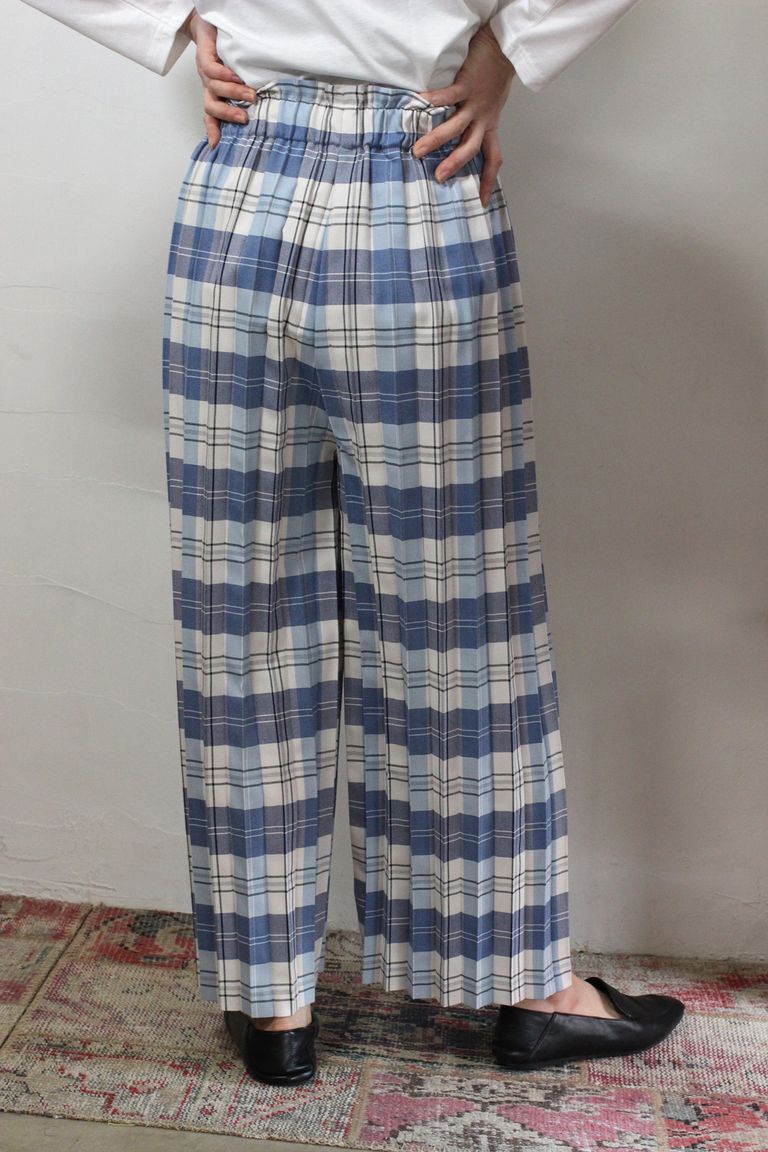 チェック柄のアコーディオンプリーツのパンツです。楽な履き心地ながら試着されてみるとキレイ目にまとまる形です。