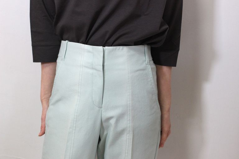 三つ巻縫製済です。裏側はパイピング等、丁寧な仕立てとなっております。イージーシルエットが涼しいベーカーデニムで、カジュアルコーディネイトをお楽しみください。