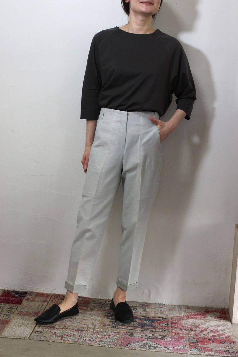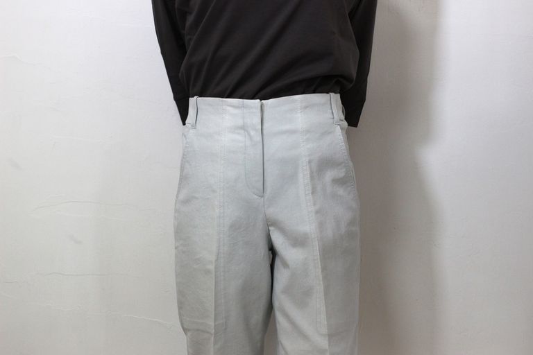 三つ巻縫製済です。裏側はパイピング等、丁寧な仕立てとなっております。イージーシルエットが涼しいベーカーデニムで、カジュアルコーディネイトをお楽しみください。